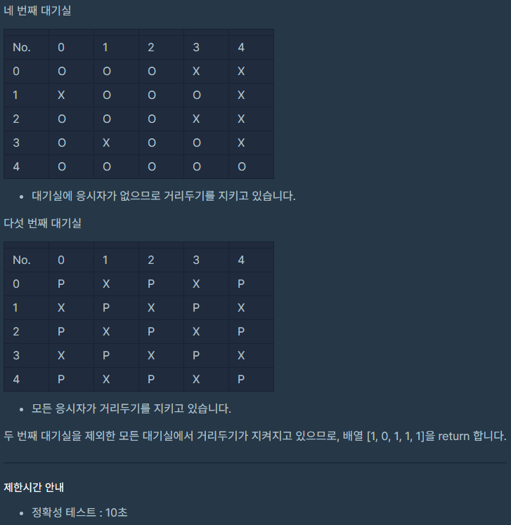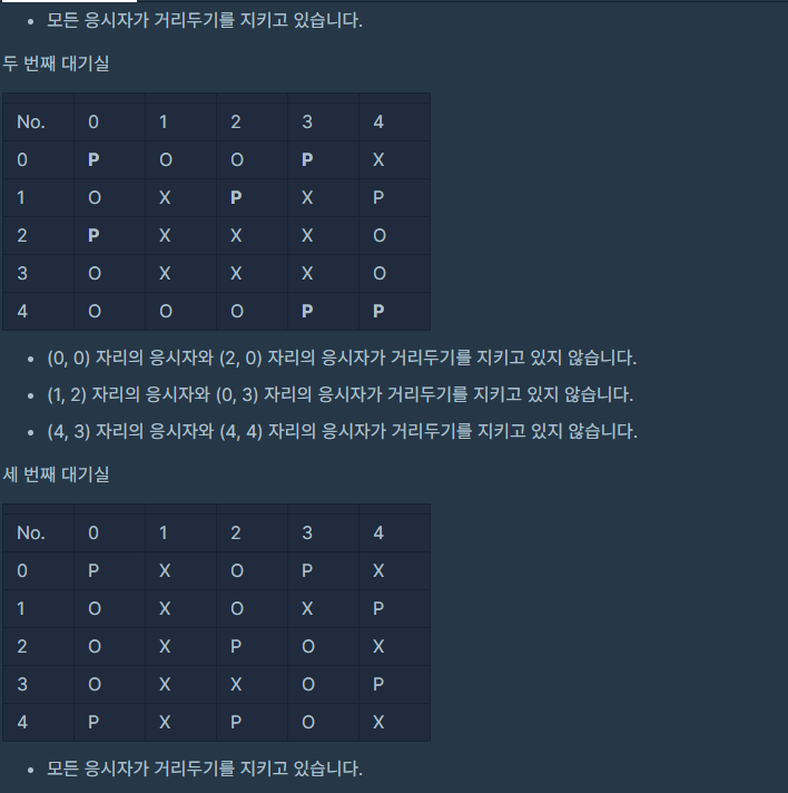 코로나 바이러스 예방을 위해 면접 대기실에서는 거리두기를 지켜야 하는데, 이 때, 각 면접실의 대기실 지원자들이 거리두기를 유지하였는지를 판단하는 문제