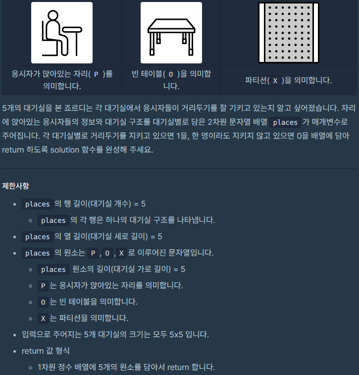 BFS 또는 DFS를 통해 주변 지원자들과의 거리를 측정하여 맨해튼 거리가 2 이하인데 파티션으로 구분되지 않은 거리에 서로 앉아있다면 위반으로 반환.